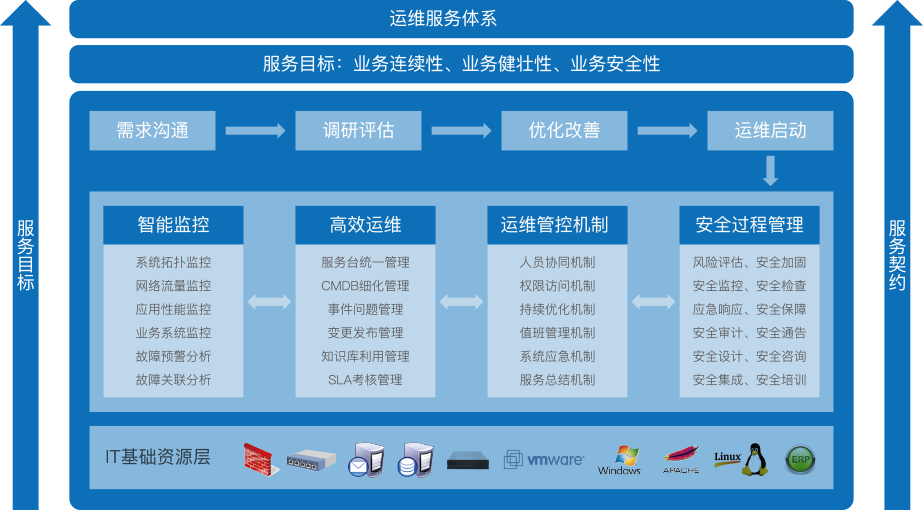 星漢運維服務體系踐行一體化運維和白盒運維理念,保障數據中心運維服務最終目標(業務連續性、業務健康性、業務安全性)實現,將您的 IT系統交給星漢進行全方位的維護,免除后顧之憂,使得客戶可以聚焦于業務創新。